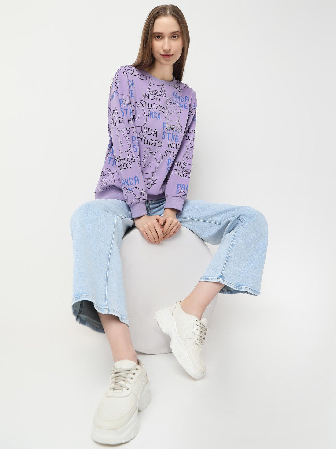 Fun, bold, and unapologetically cool. This lilac oversized sweatshirt features an all-over cartoon panda character...