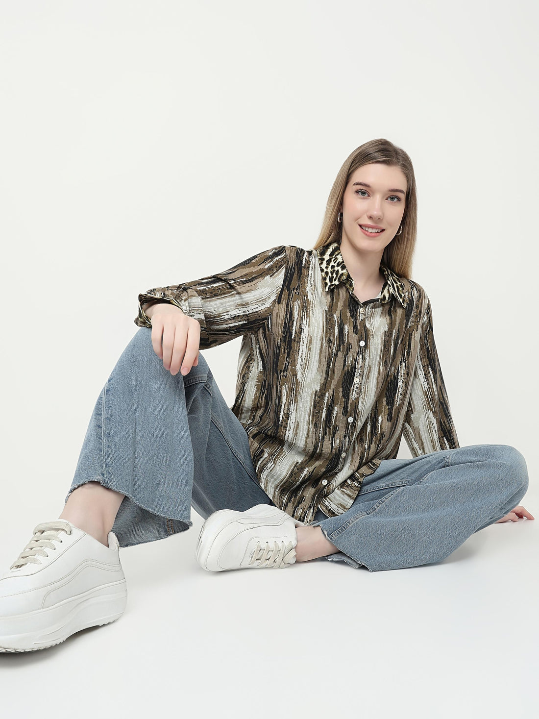 Make a bold impression with this artistic brushstroke print shirt, elevated by striking leopard print...