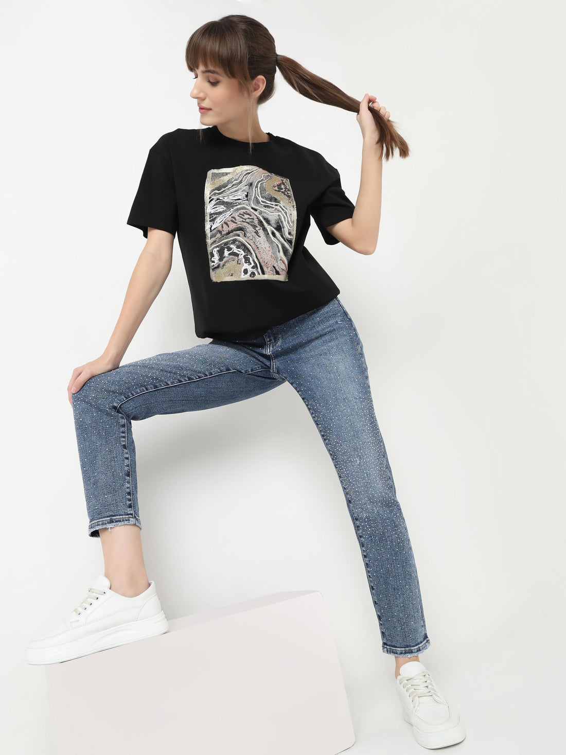 A trendy oversized tee featuring an artistic abstract graphic panel that adds a contemporary edge...