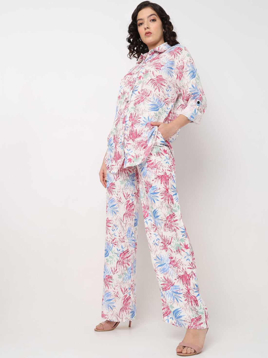 Women’s Floral Printed Co-ord Set – Shirt Top with Wide Leg Pants